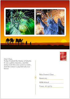 Our class has been traveling the United States to visit different sites that all symbolize America. Below are postcards from their travels.  Enjoy! :)